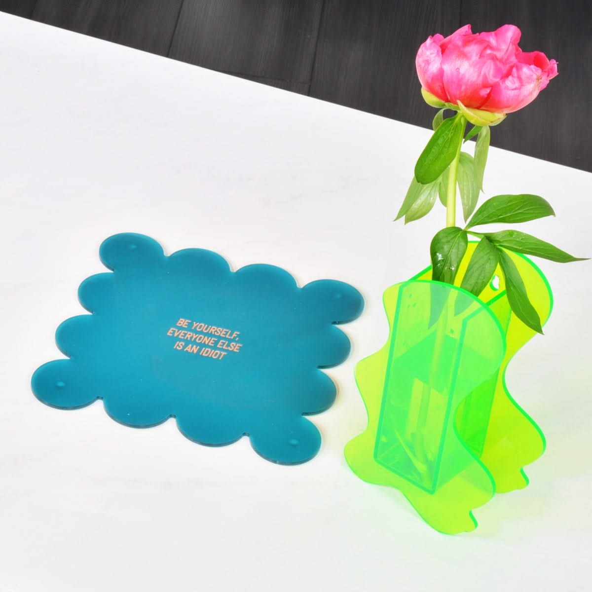 Frosted teal acrylic plate with scalloped edges and coral engraved slogan ‘Be Yourself, Everyone Else is an Idiot’