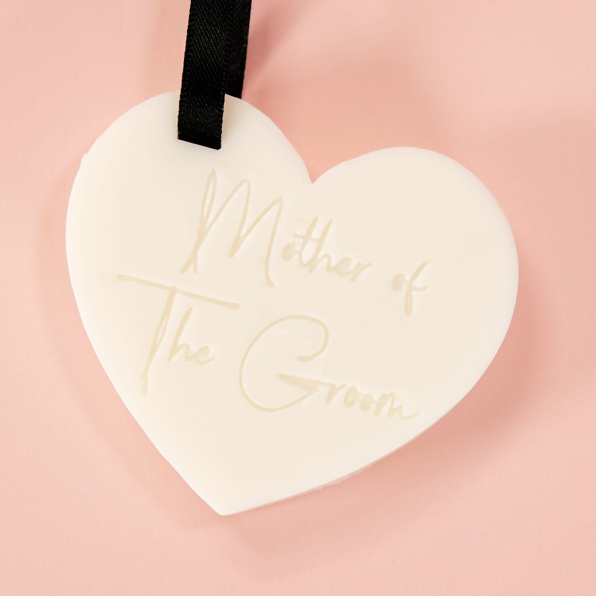 Scented soy wax hearts hanging on a black satin ribbon. Choose from pastel pink or white wax, five different messages etched into the wax and three different fragrances.