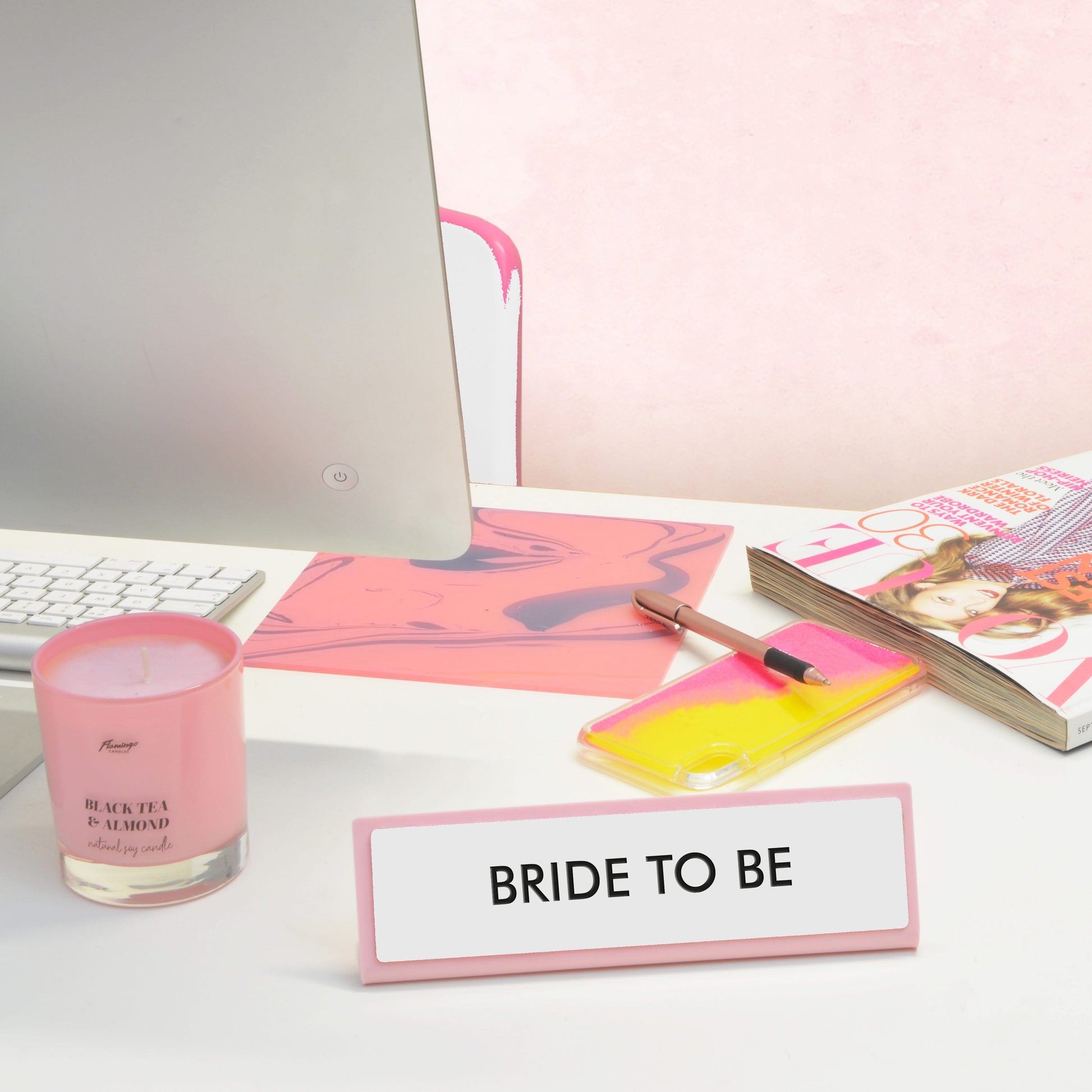 'Bride to Be' engraved onto a white plate with baby pink acrylic surround.