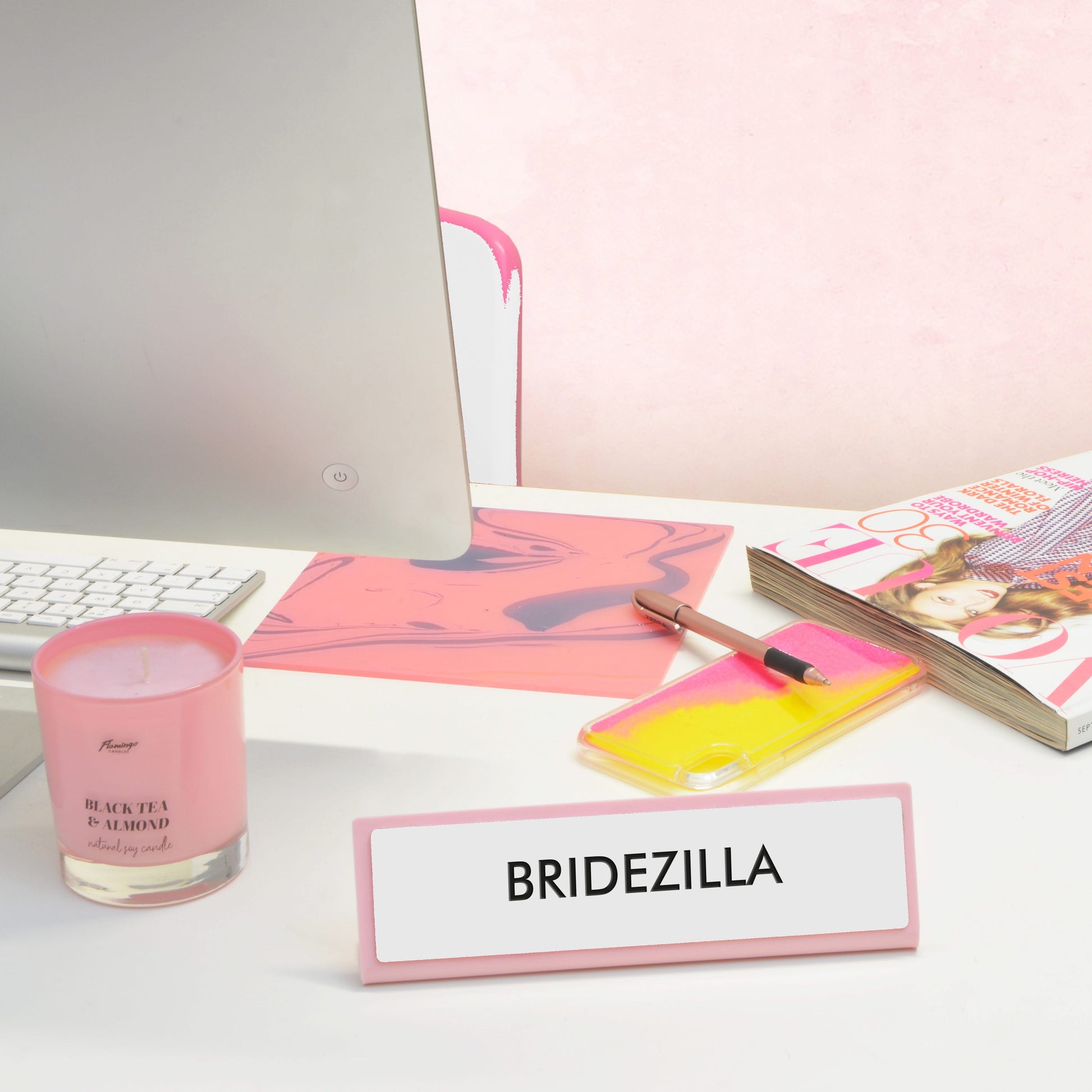 'Bridezilla' engraved onto a white plate with baby pink acrylic surround.