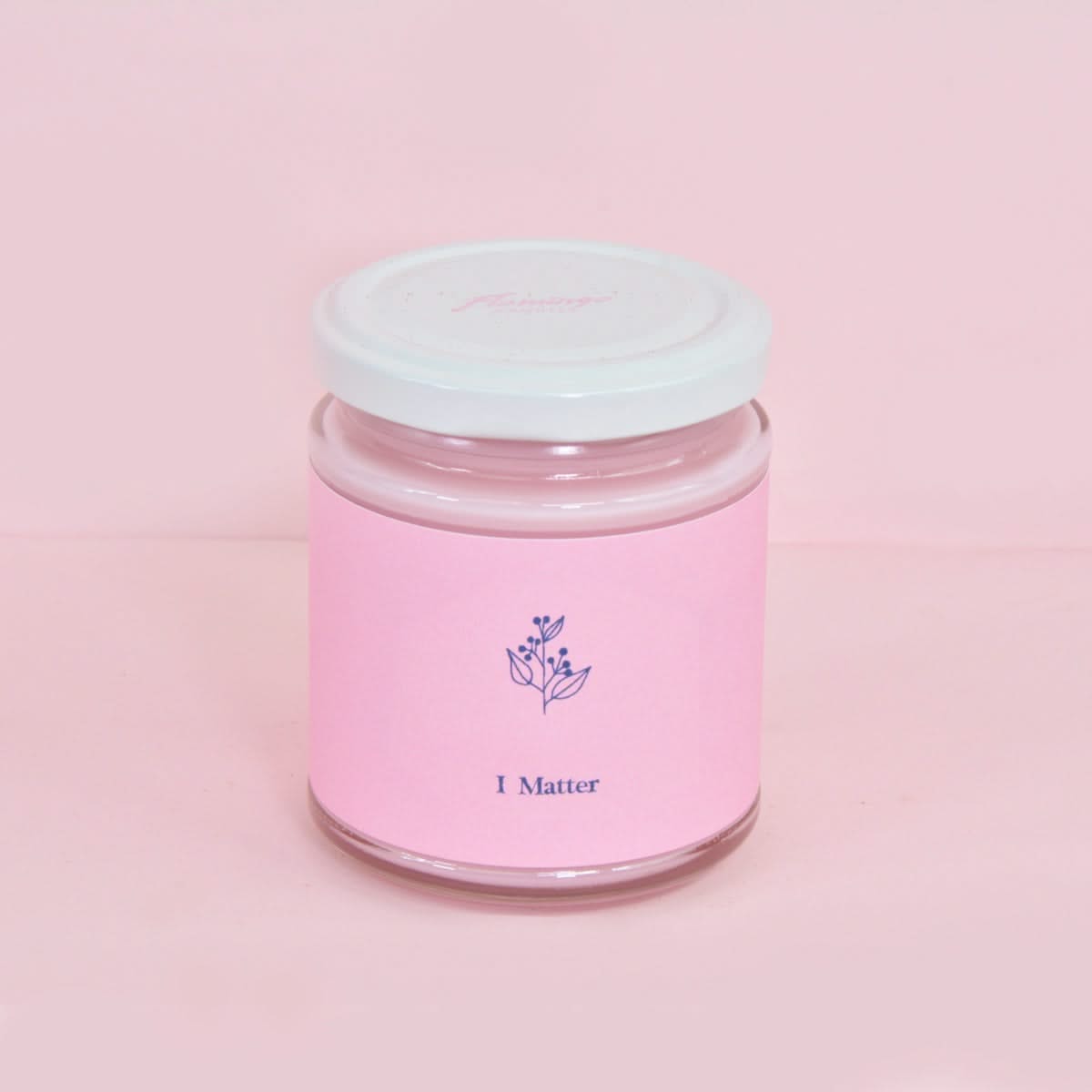 Daily inspiration in candle form. Take a deep breath and light. Pastel pink and navy round candle with pink wax, floral illustration and ‘I matter’ affirmation. Scented with Frangipani & Lemon, a blend of Frangipani, rose and magnolia, combined with top notes of lemon & lime enhanced by nuances of peach with an amber and musk base.
