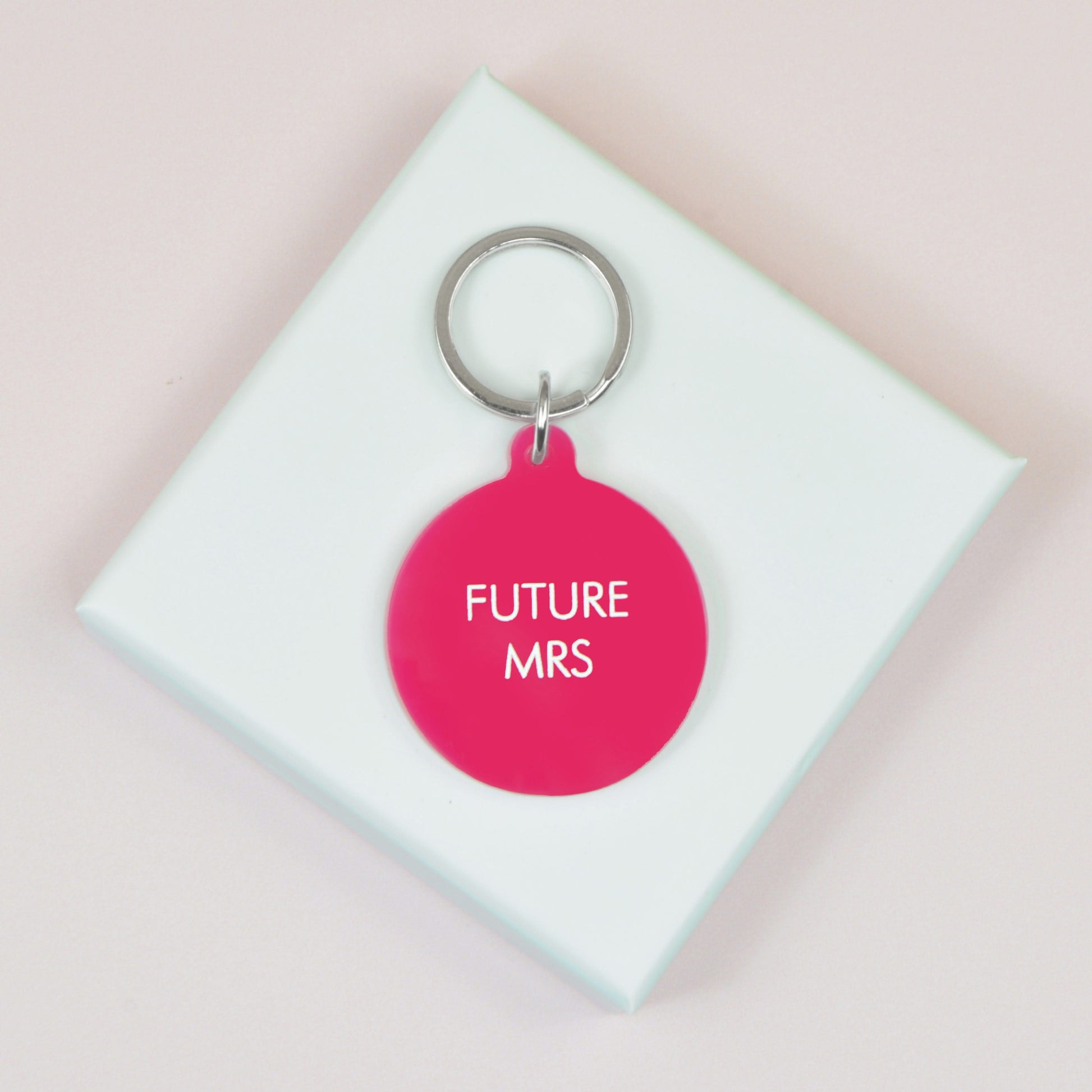 'Future Mrs' engraved on bright pink acrylic with white text and a silver keyring.