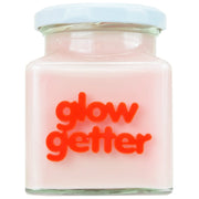 Pink wax with red 'glow getter' slogan in Rose Velvet & Precious Oud - a floral accord with notes of oudh, rose, geranium, jasmin, clove and praline resting on a rich velvety base of cedarwood, sandalwood, vetivert, amber, musk, vanilla, patchouli and a hint of raspberry.