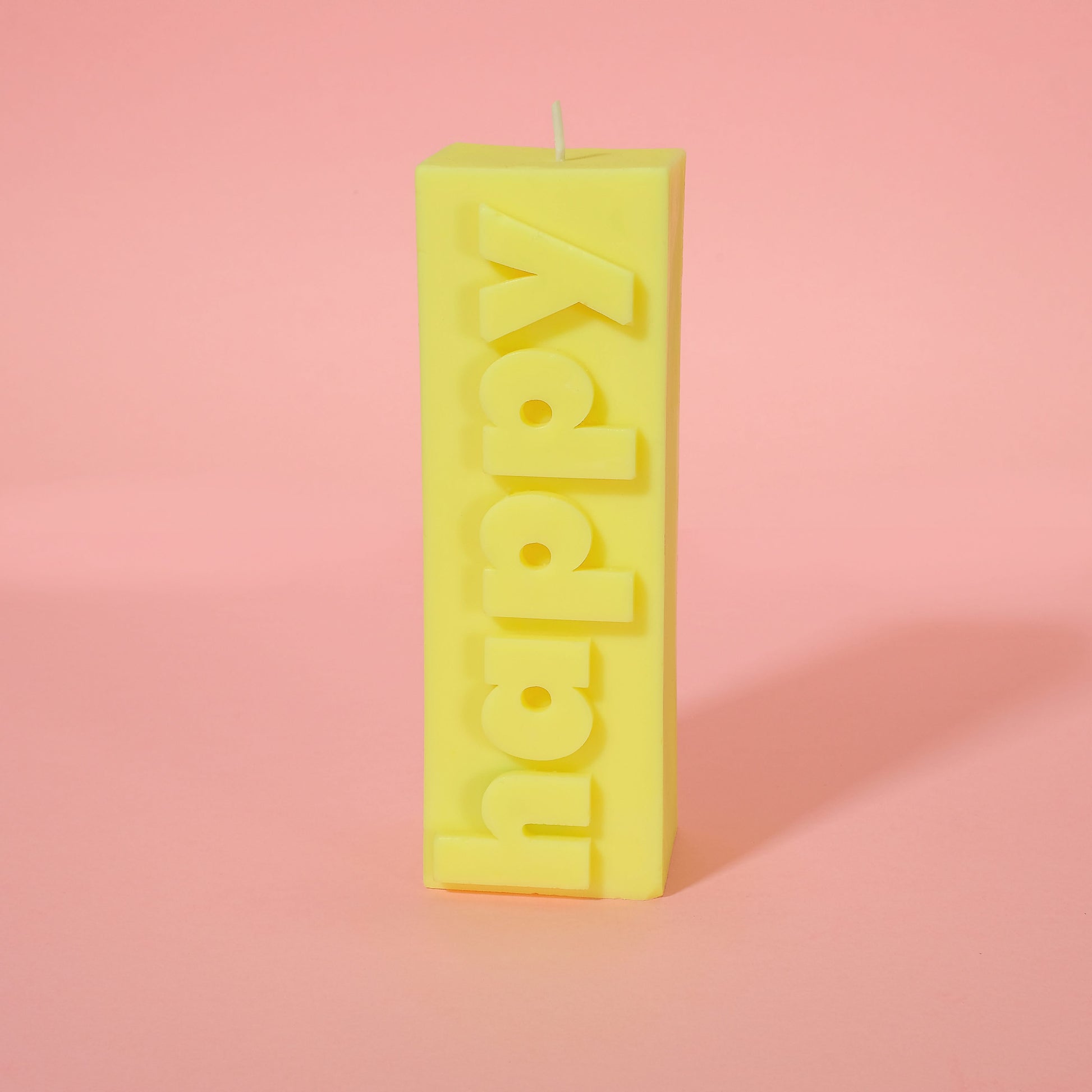 An unscented neon yellow HAPPY block text candle hand-poured with soy wax and designed to stand out.