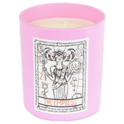 The Empress Tarot Card represents femininity, new beginnings and creativity. Black and white tarot card design on a pastel pink jar candle. Scented with Honey & Tobacco, a warming fragrance with notes of bergamot, honey, cinnamon and clove mixed with tobacco, patchouli, vanilla and musk.