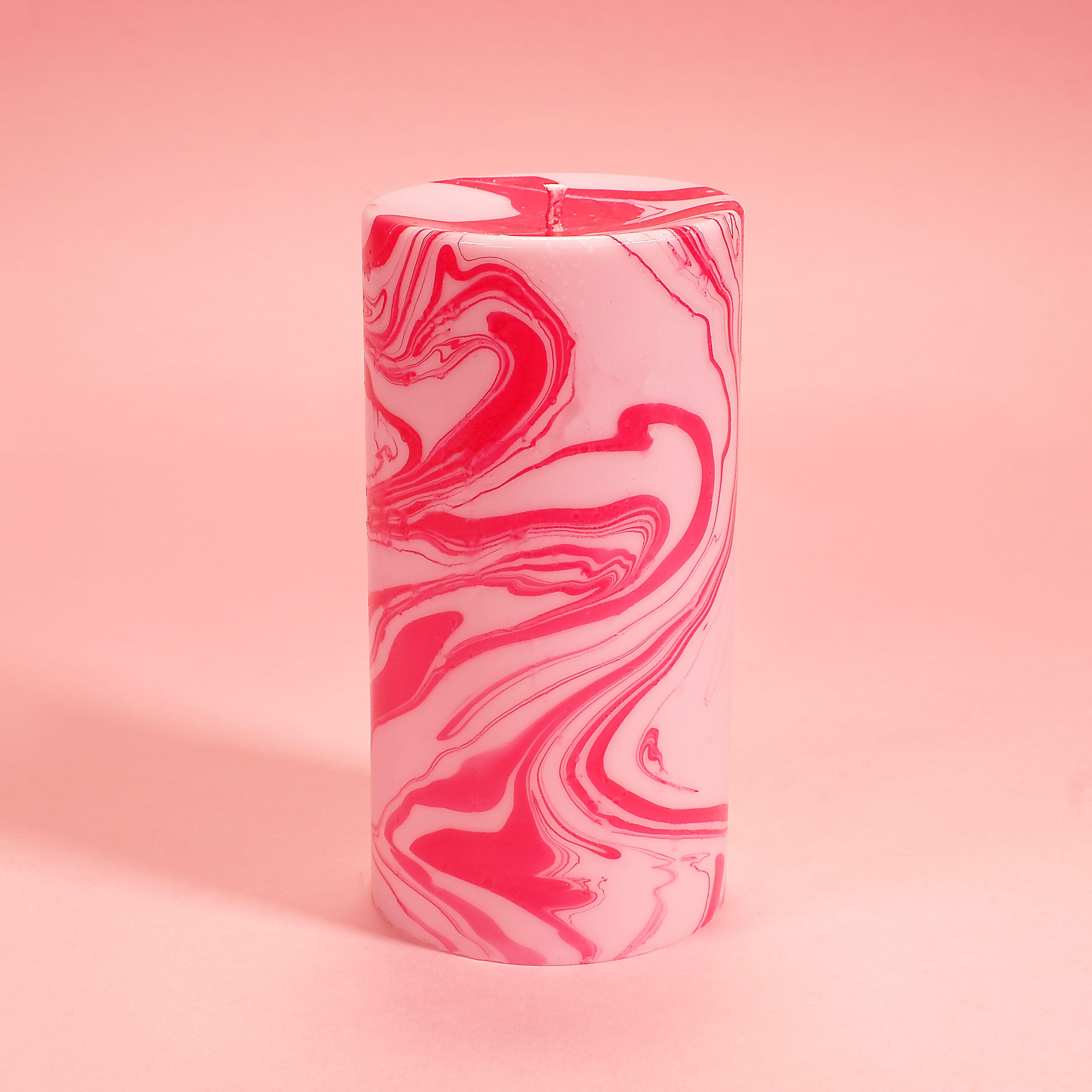A lavish unscented pillar candle hand-poured with soy wax and dip-dyed in red and pastel pink to create the eye-catching marble swirl.