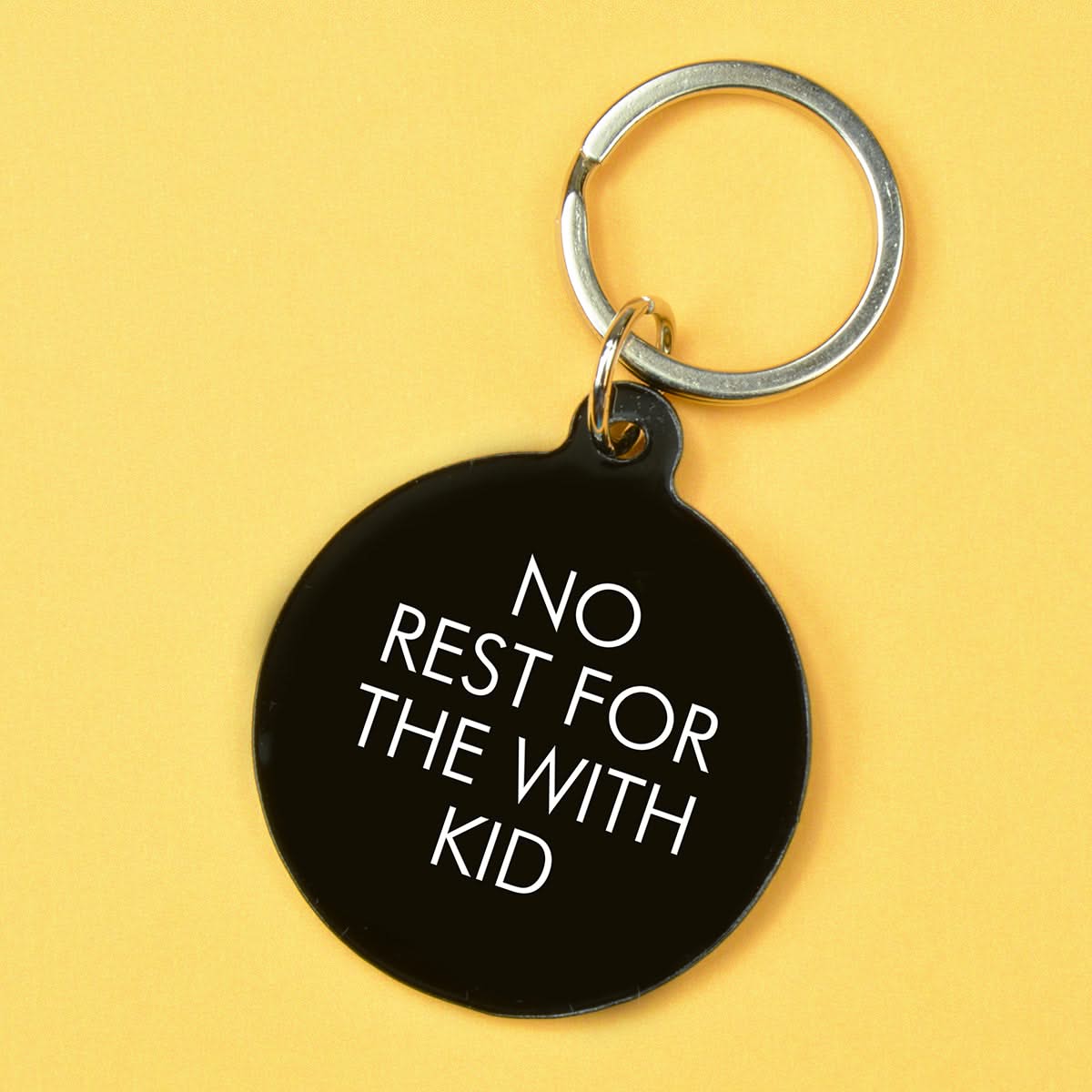 'No rest for the with kid' engraved on black acrylic with white engraving and silver keyring.