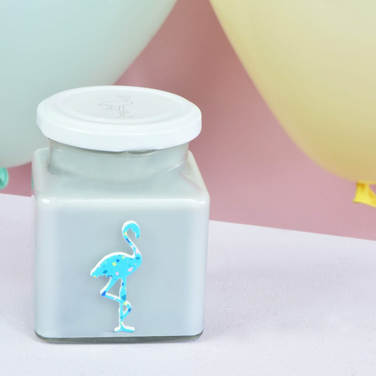 A lilac wax with blue terrazzo print acrylic flamingo in Silver Needle & Rose Tea, a delicate scent enriched with rose, light lemon top notes, an infusion of tea, tender sage with a soft cedarwood and amber base alongside strong musky aspects.